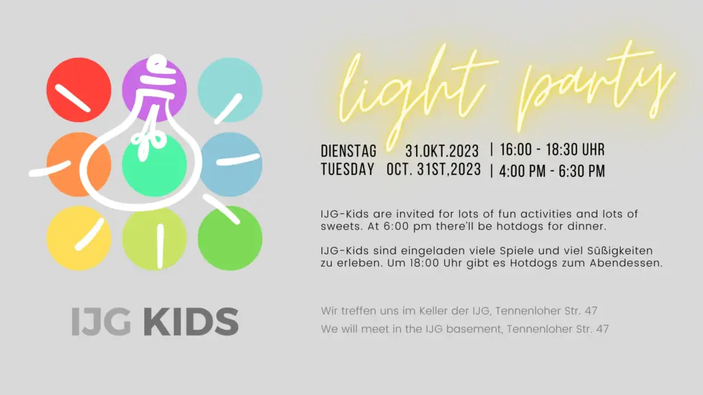 IJG-Kids are invited for lots of fun activities and lots of sweets. At 6:00 pm there’ll be hotdogs for dinner.